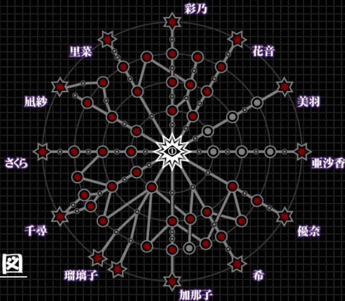 在游戏内玩家可以通过路线图中【苑】的平面图来确认以悠斗(或者玩家自己)为中心与新娘们的远近关系,直观感受在各方面的推进,一步步地发掘不同路线。(因为同属于苑,所以也有一些双人、三人的场景)