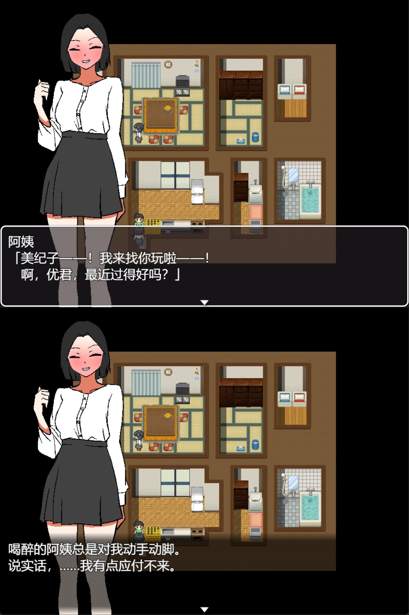 概要: 时间会根据步数和发生的事件而推进。 听取阿姨的请求或者闲聊会影响“好感度”……根据时间段和之前立下的flag,事件的发生与否也会有所不同。 有总共14个H场景。 通关后有回想房间。 游戏中看过的H场景,可以在回想房间里重新观看。 没有看过的H场景,也可以在回想房间里全部解锁。