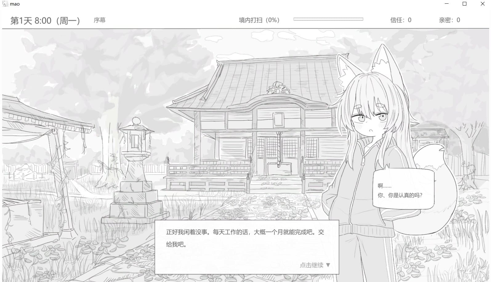 这是与独自居住在神社的长寿萝莉狐一起度过30天的共处模拟游戏。 女主角的名字叫万尾。他们已经很久没有交流了,感觉有点尴尬,一开始也显得有点沮丧。 主角的工作是清理破旧的寺庙场地。如果你一点一点地清理干净,万尾 就会开始按照你说的做任何事情作为奖励。随着你们关系的加深,你们将能够做更多的事情。 在性倾向上,他们一开始是无知/笨拙的,最终目标是甜蜜的