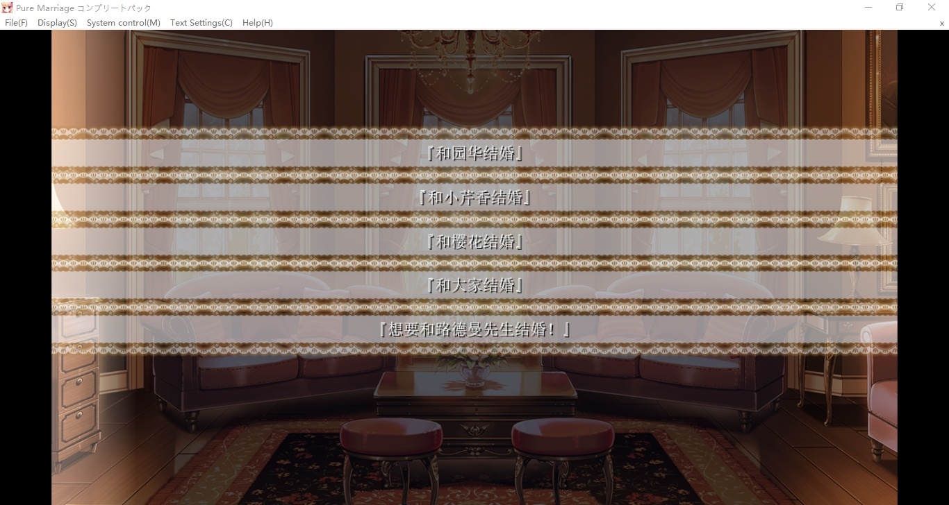 去补丁铺子(https://zeas2.github.io/Kirikiroid2_patch/patch)搜索pure marriage,下载标题为“Pure Marriage ~赤い糸物語 ハーレム編~”的补丁,复制到根目录在运行游戏。