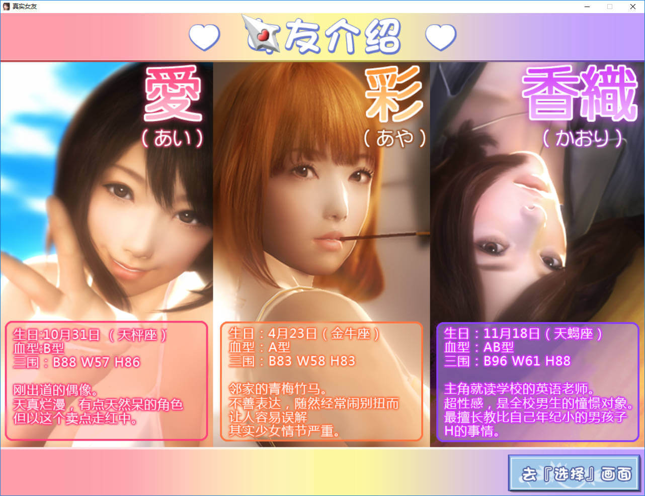 《真实女友》(リアル彼女/Real Kanojo)是由日本株式会社Eye One成人向游戏品牌ILLUSION SOFT制作的一款成人向高品质实时3D(ハイクオリティ リアルタイム3D)美少女单机游戏,于2010年2月19日发售。游戏强化人们去设计自己内心的完美女神,从而进行基础的性教育,取得了相当大的成功。