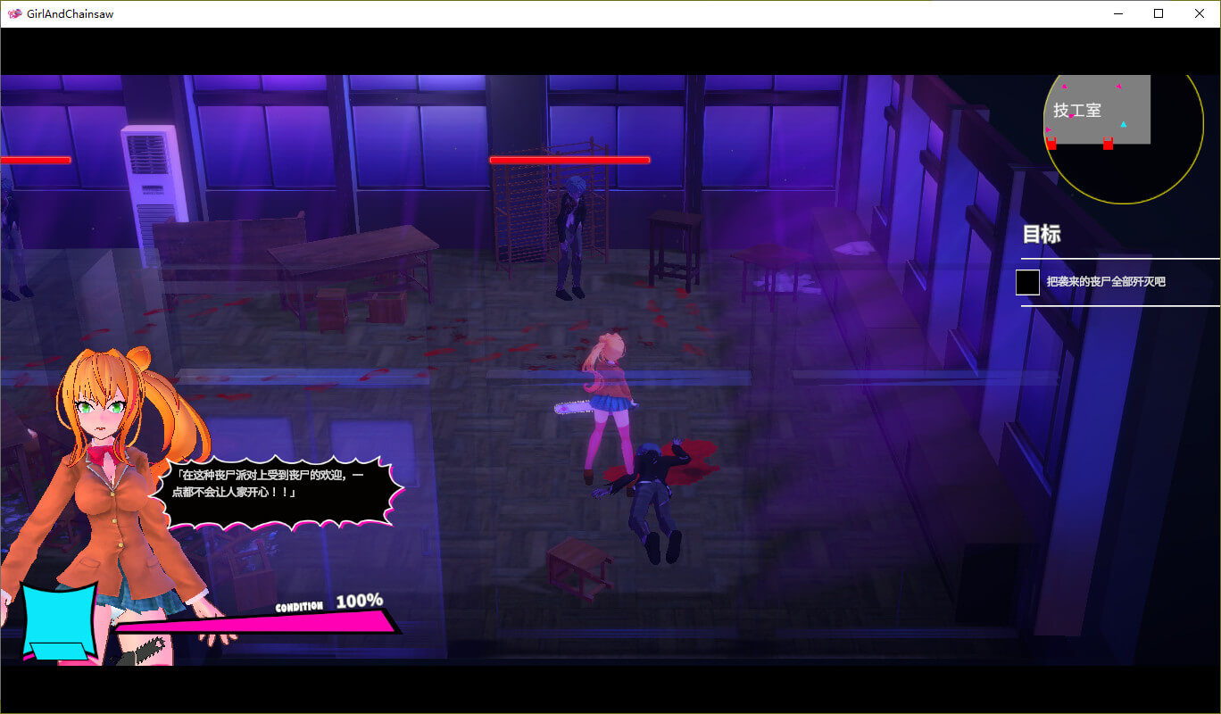 为了逃离校舍,姬酱单手拿起电锯全力逃跑著!