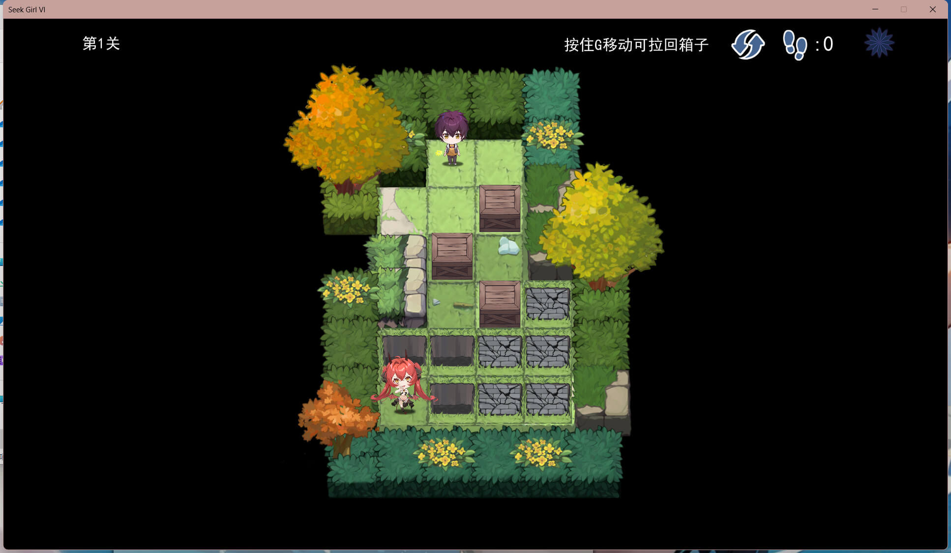 這是一款推箱子的休閑游戲。玩家需要控制男孩找到妹子完成任務進入下一關卡。這個過程有很多阻礙和陷阱,這需要玩家移動箱子將陷阱填補。巧妙的關卡設計和精美的角色立繪使玩家開動腦筋。發揮你的智慧,營救被困的妹子。
